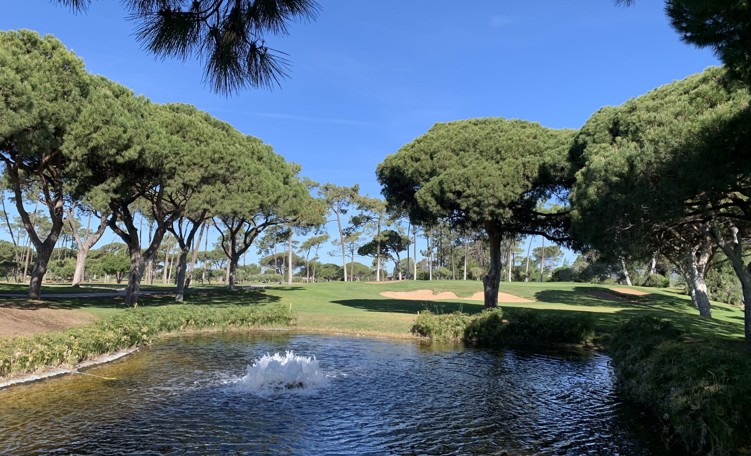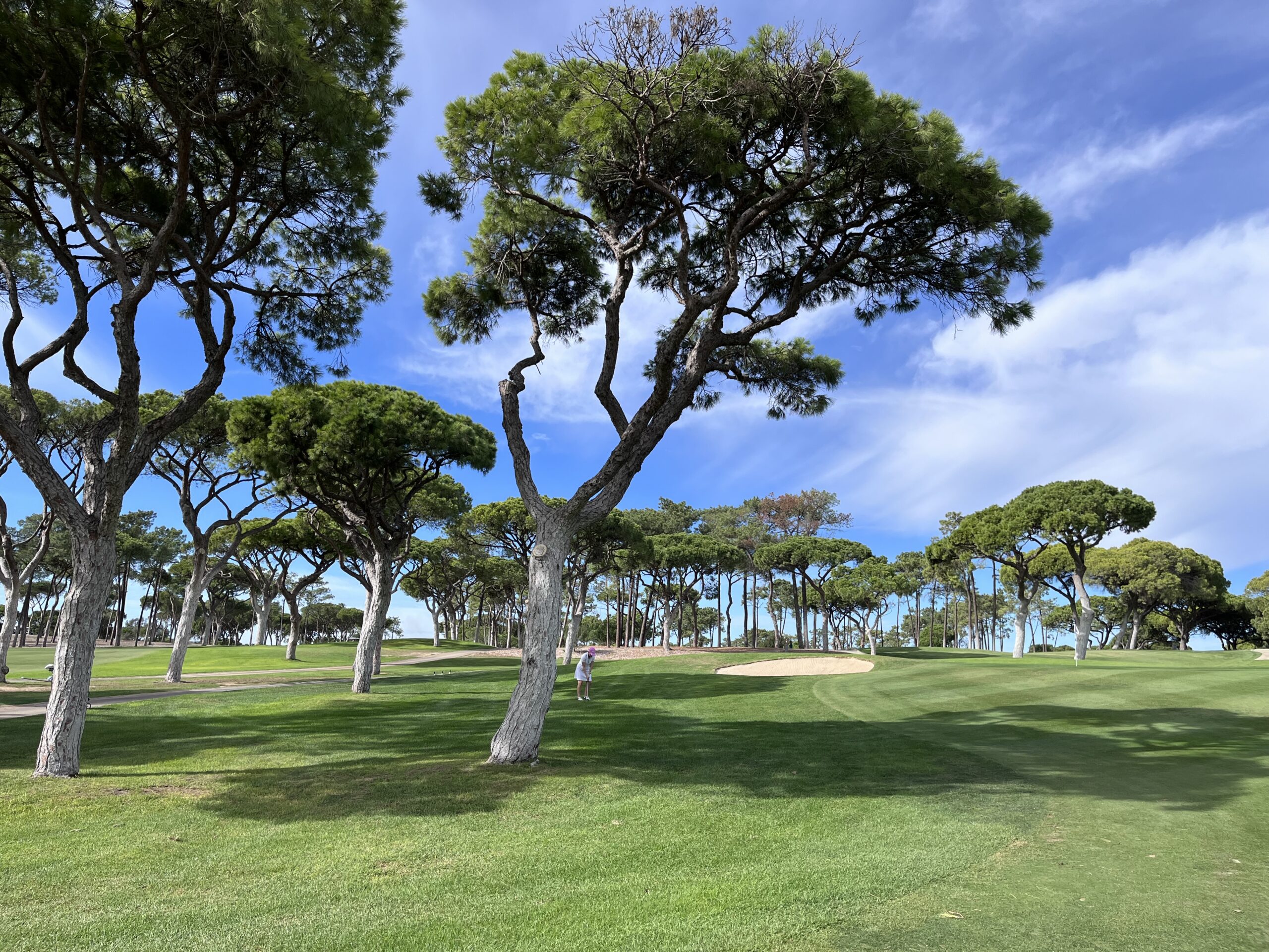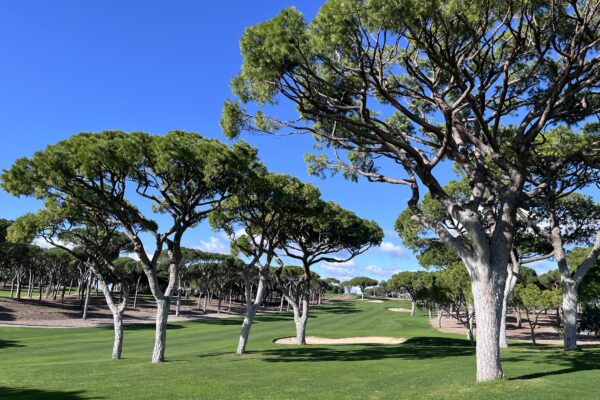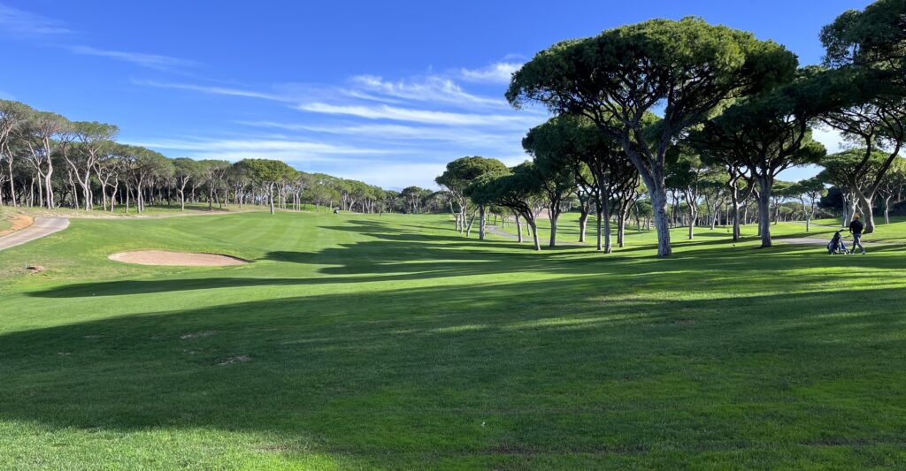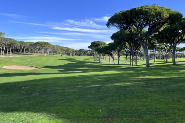 Na zakończenie stajemy w szpalerze wysokich sosen, luźno poustawianych po obydwu stronach. Nie ma więc wątpliwości, którędy biegnie dołek. Pierwszy strzał kierujemy na drugi z dwóch bunkrów po prawej stronie. Na tym odcinku fairway biegnie prosto. Ulokowanie piłki po prawej będzie korzystne, ponieważ drugie uderzenie skierujemy już nieco bardziej w lewo – dołek minimalnie się wygina. Na zakręcie rośnie po lewej kilka niskich drzewek, które lepiej ominąć prawą stroną.